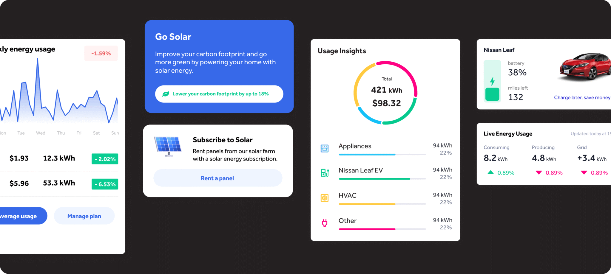For customers with solar and EVs, the app provides dedicated experiences that were previously absent. The solar module tracks production in real time; the EV module manages charging and cost.