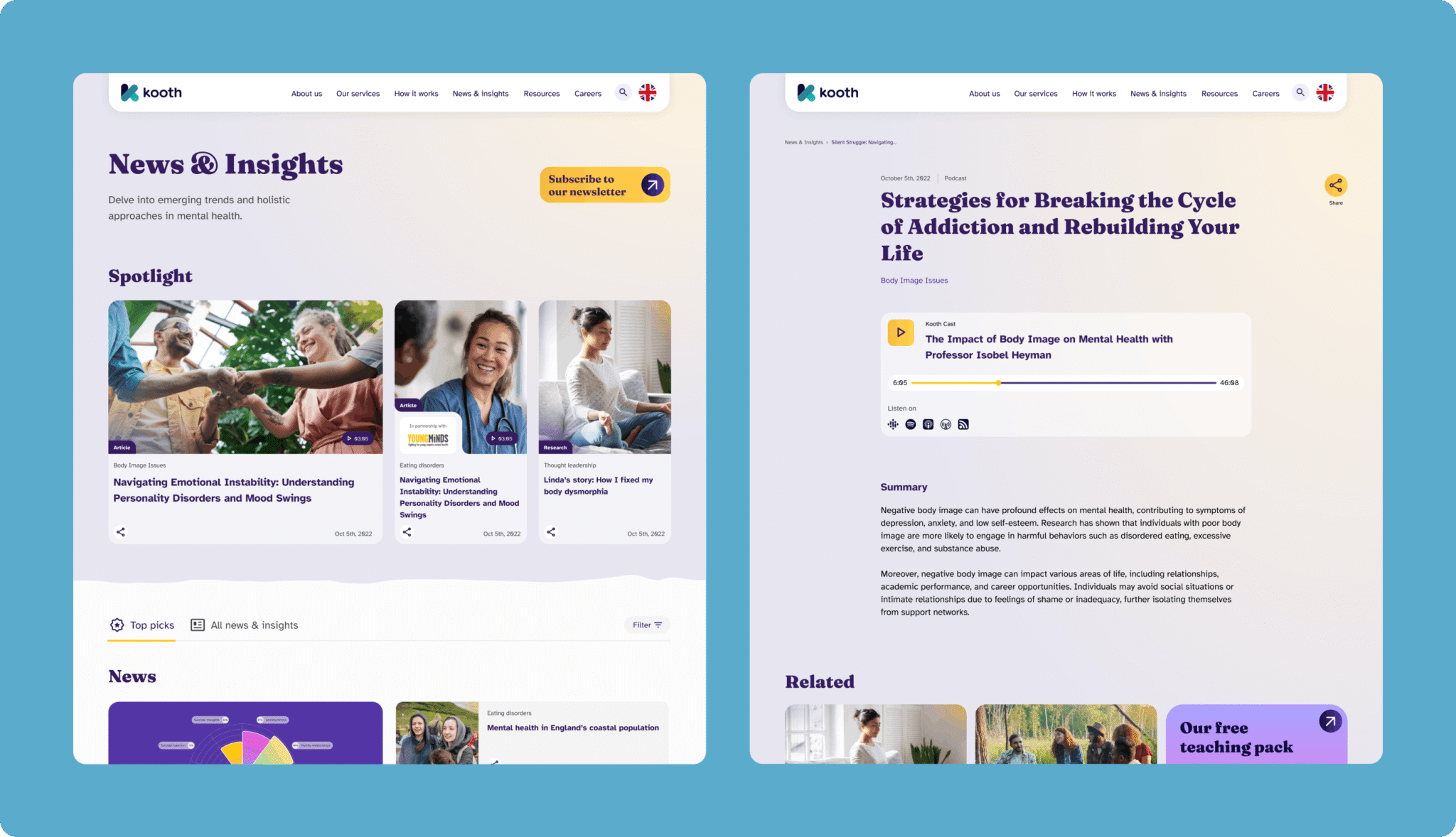 We built a multi-market web platform serving Kooth in the UK and Soluna in the US. A robust CMS and custom modules give editorial teams full flexibility per market.