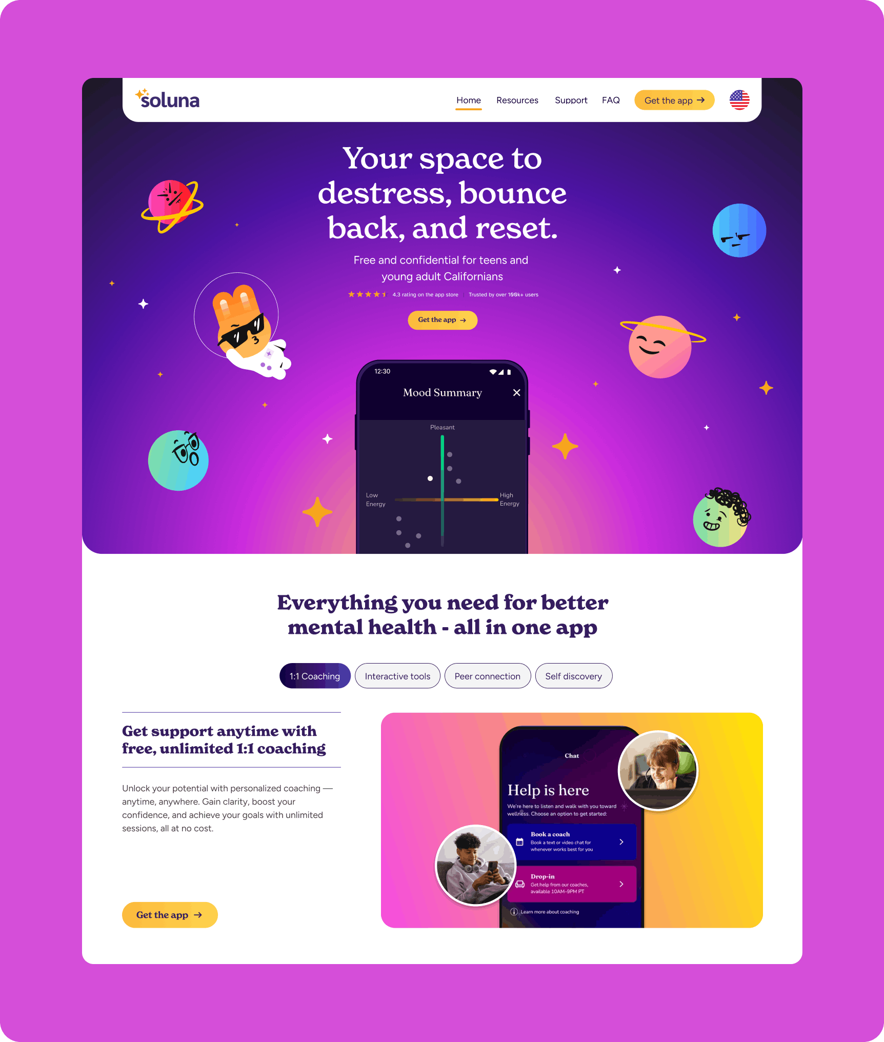 Soluna connects young people aged 16-25 with free peer forums, resources and one-to-one coaching, no insurance required. We built a warm, brand-led experience with infrastructure to scale US state partnerships.